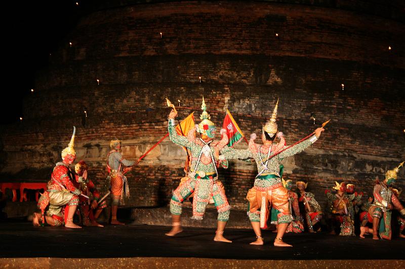 | Eine nächtliche Khon-Aufführung vor der Ruine einer Stupa in Sukhothai. Die maskierten Darsteller präsentieren 4 typische Charaktere: Männer, Frauen, Affen und Dämonen. Die Darsteller spielen pantomimisch den von einem Erzähler vorgetragen Text. Ziemlich monoton, aber irgendwie doch faszinierend. | |