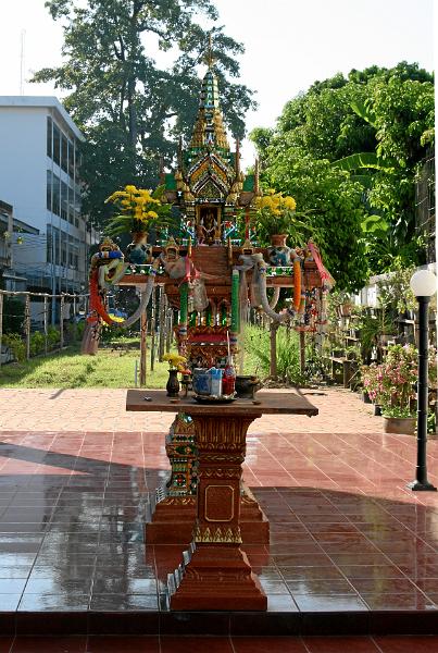 | In Chiang Mai. An nahezu jedem Wohn und Geschäftshaus ist auch ein mehr oder weniger prunkvolles Geisterhäuschen aufgestellt. Mit Opfergaben (Speisen und Getränke) soll der Erdgeist besänftigt werden, der beim Bau des Hauses vertrieben wurde. | |